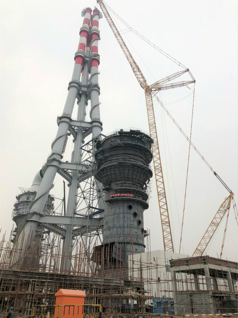 2018年12月25日上午10點10分,山鋼日照精品鋼基地2×350MW自備電廠工程三管自立式鋼煙囪第七層A、B、C筒順利吊裝就位,煙囪主體鋼結(jié)構(gòu)吊裝到頂。這標志著我國第一根180米三管自立式鋼煙囪,也是首根采用內(nèi)壁鈦板貼襯防腐的大型鋼管結(jié)構(gòu)煙囪的落成。